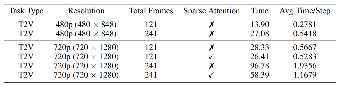 • 轻量级高性能架构:我们提出了一种高效架构,将 83 亿参数的 Diffusion TransformerDiT与 3D 因果 VAE 相结合,在空间维度实现了 16 倍的压缩,在时间轴上实现了 4 倍的压缩。此外,创新的 SSTA机制修剪了冗余的时空 kv 块,显著减少了长视频序列的计算开销,并加速了推理,在 10 秒 720p 视频合成中,相比 FlashAttention-3 实现了端到端 1.87 \times 的加速。